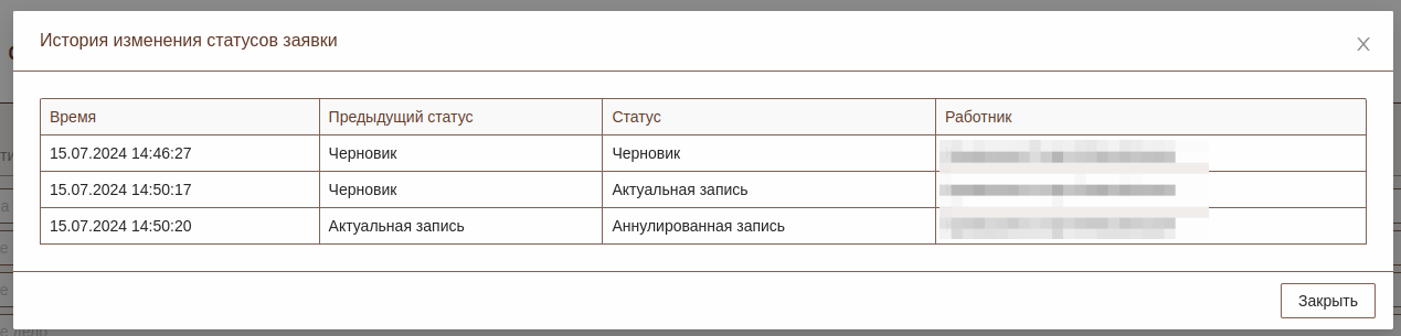 Для всех записей в реестре доступа история изменения статусов записи. Отображается информация о времени изменения, сотруднике который изменил статус, предыдущий и актуальный статус.