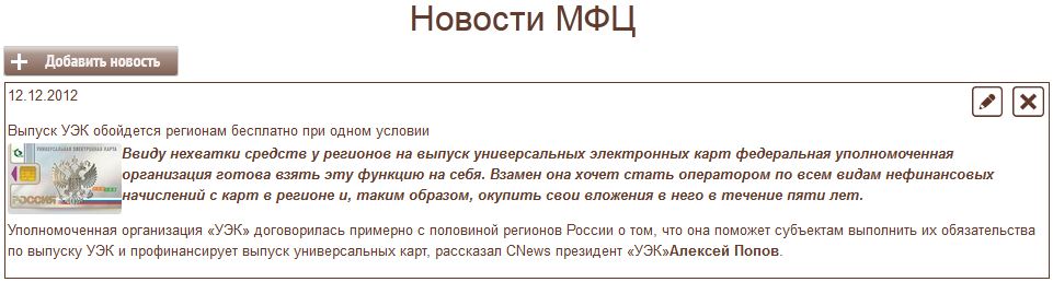 Для менеджера добавлена возможность добавлять новости в МФЦ.