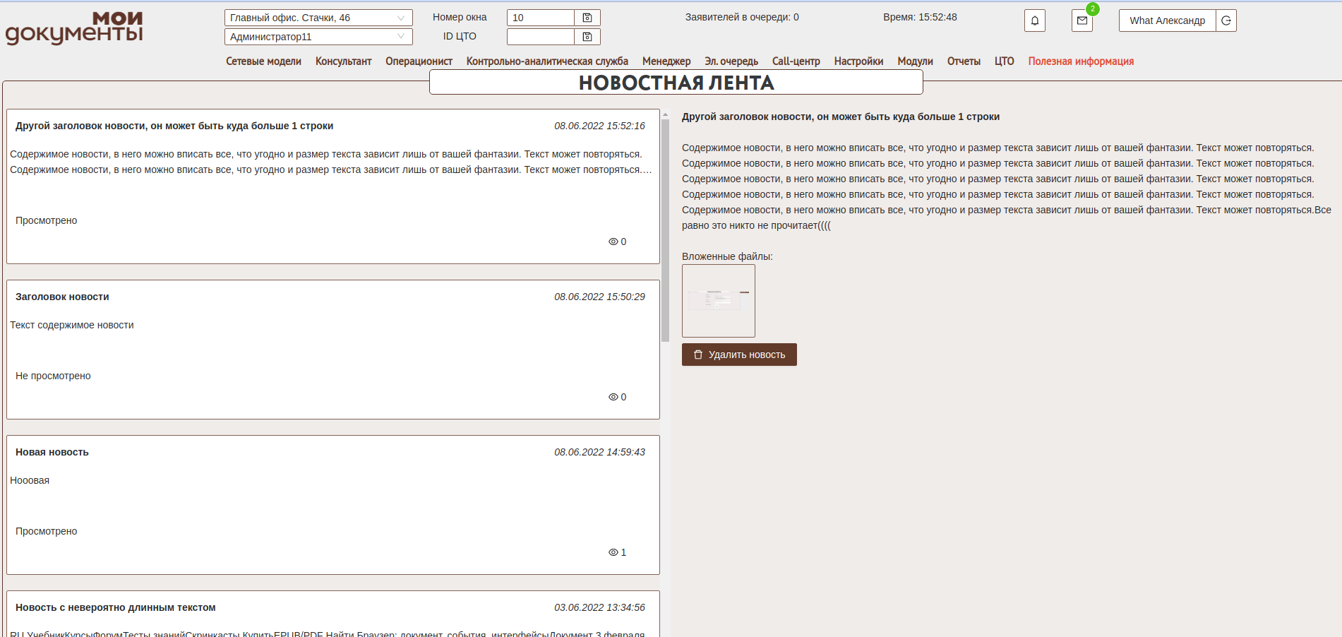 Так (на 08.06.2022) выглядит форма просмотра новостей. По клику на левый блок с новостями, на правом блоке отобразится, все содержимое новости, включая и вложенные файлы, которые можно просмотреть, либо скачать, также в базу будет проставлено, что данный сотрудник прочитал эту новость. Дополнительный функционал у менеджера и администратора: Менеджер может видеть, сколько человек ознакомились с новостью, а администратор в добавок к этому может еще и удалить любую новость.