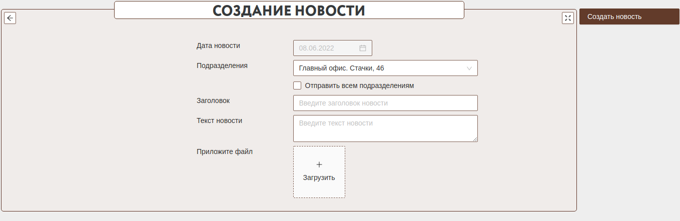 На форме создания новостей, мы можем наблюдать несколько подряд идущих полей: Дата новости - заблокирована и не доступна для редактирования, по умолчанию стоит текущий день; Подразделения - Предоставлен список всех подразделений и галочка для отметки для отправки всем подразделениям (доступно только администратору, у менеджера нет доступа для редактирования). Заголовок новости, Текст новости и доступно приложить файлы. Файлы хранятся в Файловом хранилище и при удалении также удаляются и из него. После заполнения данных полей, потребуется нажать кнопку создать новость. По нажатии на кнопку, при включенном сервисе сообщений, всем сотрудникам в указанном подразделении, либо во всех, придет соответствующее сообщение, что появилась новость.
