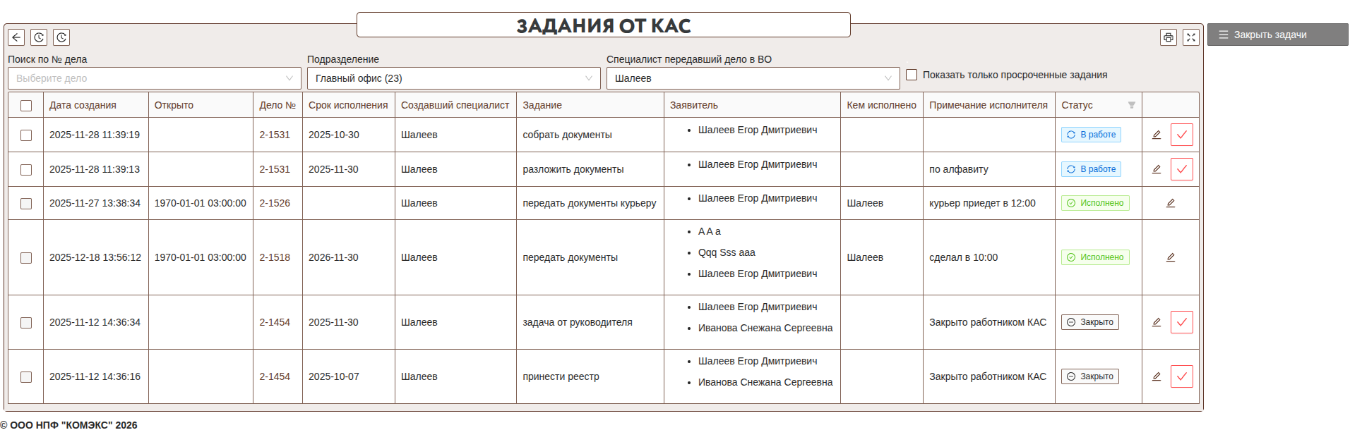 Она позволяет одновременно завершить несколько заданий от специалистов КАС, что существенно экономит время при большом потоке однотипных поручений.