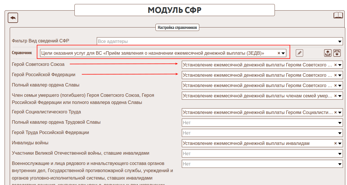 в форме Модули-->Модуль СФР-->Настройка справочников модуля настроить соответствие категорий и целей оказания услуг.