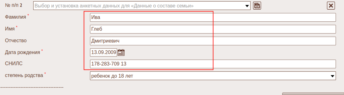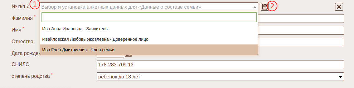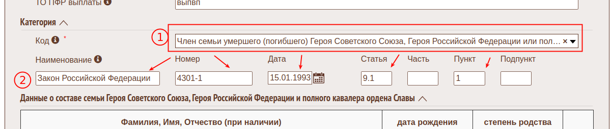 При заполнении раздела "Данные о составе семьи Героя Советского Союза, Героя Российской Федерации и полного кавалера ордена Славы"