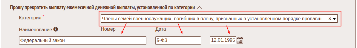 При вводе или изменении категории происходит автоматическое заполнение информации по соответствию категории закону. (справочник категорий и соответствие закону заполняется согласно классификатору отдельных категорий граждан, имеющих право на получение ЕДВ описан XSD схеме вида сведений) При необходимости информация может быть изменена оператором.