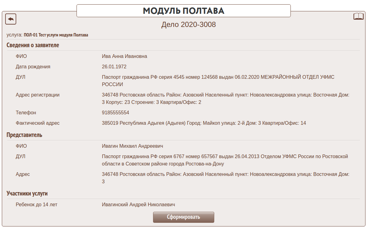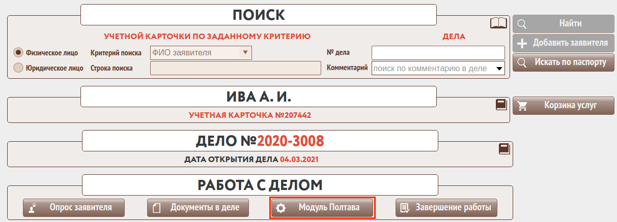 После прохождения опросника и добавления документов в дело возможна отправка дела в ИС "Полтава"