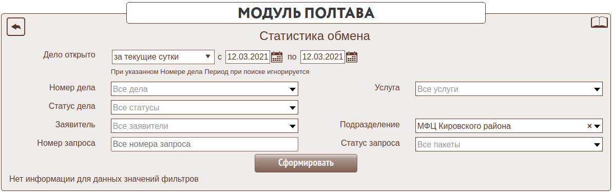 Для оперативного контроля взаимодействия модуля с ИС "Полтава"(Модули->Модуль Полтава->Статистика обмена) предназначена форма "Статистика обмена".