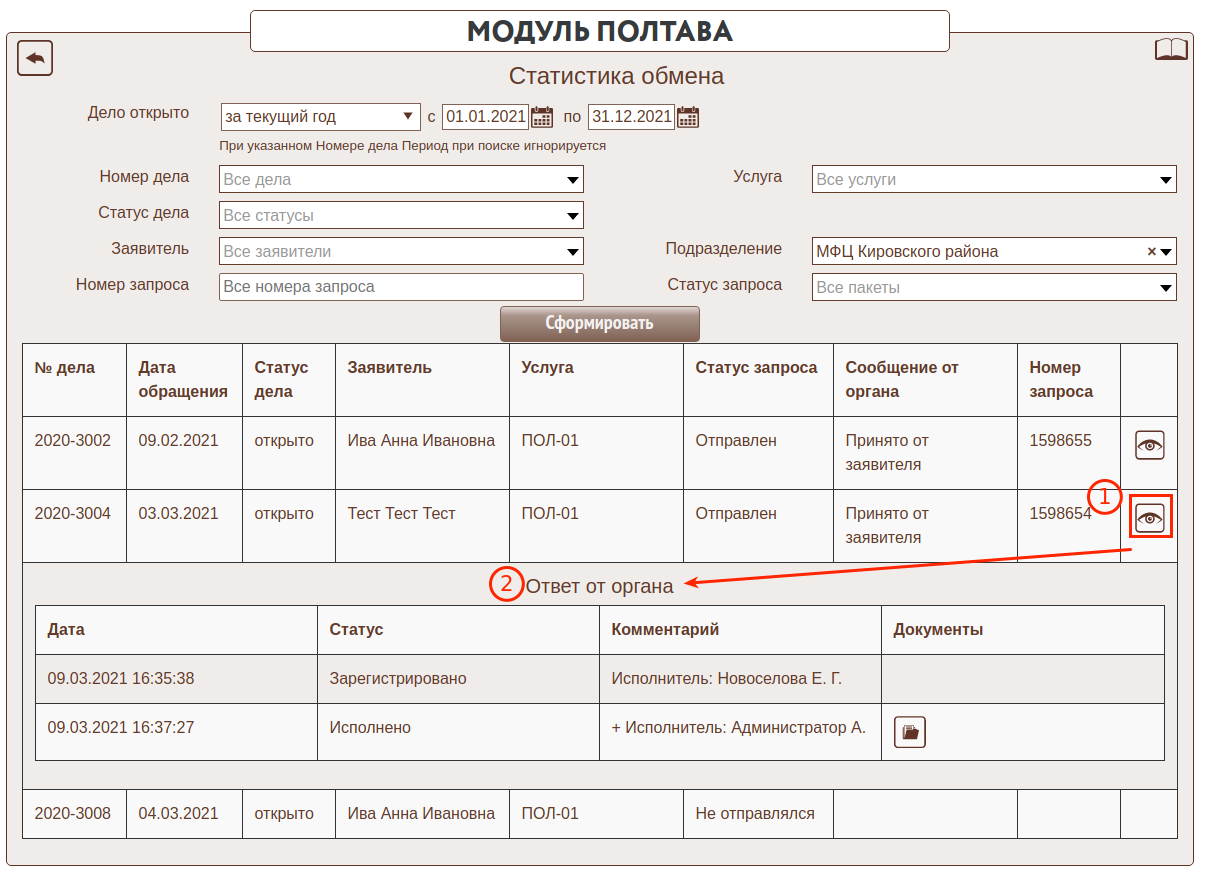 позволяющая найти любое дело, принадлежащее модулю и просмотреть запрос и статусы ответов органа и документы-ответы органа.