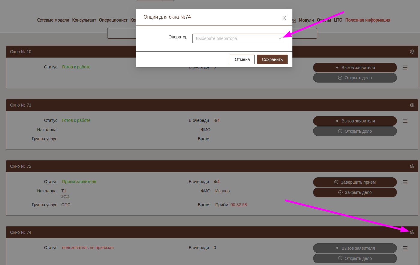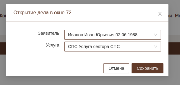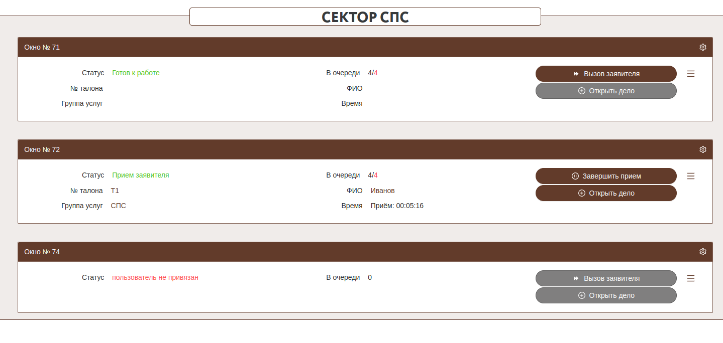 Взаимодействие с талоном идентично работе с обычными талонами очереди - эти талоны также отображаются в "контроле очереди", также могут быть переданы в другое окно, также отображаются на экране очереди и т.п. При открытии/закрытии дела оператором считается не оператор, приписанный к окну, а оператор нажимающий кнопки в форме "Сектор СПС", то есть реальный сотрудник МФЦ. Дальнейший учет дел и талонов идентичен обычной работе - формы отчетности, МДМ, BI система и т.д.
