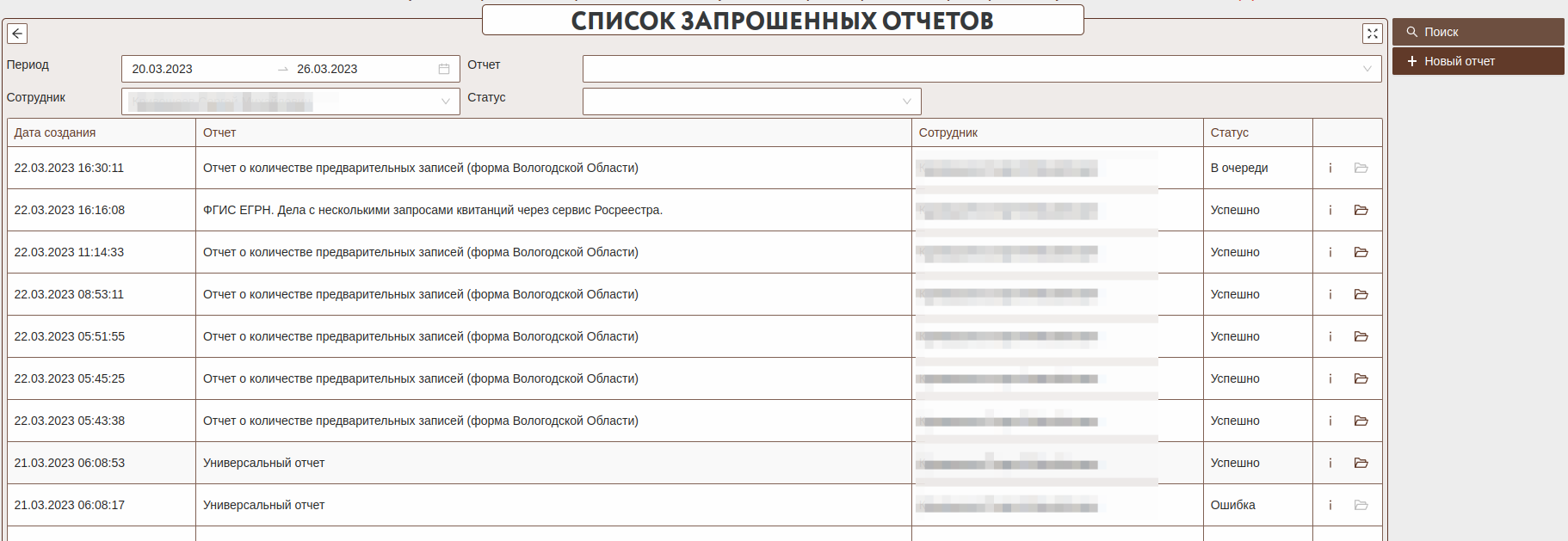 Для формирования нового отчета необходимо нажать кнопку "Новый отчет". В открывшейся форме необходимо выбрать параметры отчет и нажать кнопку "Сформировать". После этого будет открыта форма с информацией об отчете. На этой странице будет отображена информация о запросе, в т.ч. статус запроса. Далее запрос будет в асинхронном режиме добавлен в очередь и сформируется печатная форма отчета. Можно остаться на этой странице и дождаться изменения статуса на "Успешно". Или закрыть страницу и проверить статус запроса через форму "Список запрошенных отчетов".