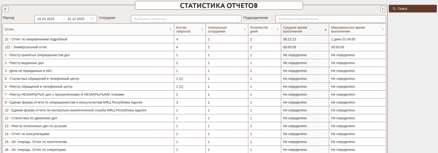 Описание колонок: 1. Кол-во запросов - сколько всего было запросов за указанный период. 2. Уникальные сотрудники - кол-во работников, которые формировали отчет. Позволяет проанализировать о популярности отчета среди сотрудников. 3. Количество дней - Сколько дней из указанного периода формировали отчет. Попадут в статистику, если в день был сформирован хотя бы один отчет. 4. Среднее/максимальное время выполнения - время выполнения формирования отчета. Т.к. каждый отчет мог отличаться по фильтрам формирования время выполнения может сильно отличаться.