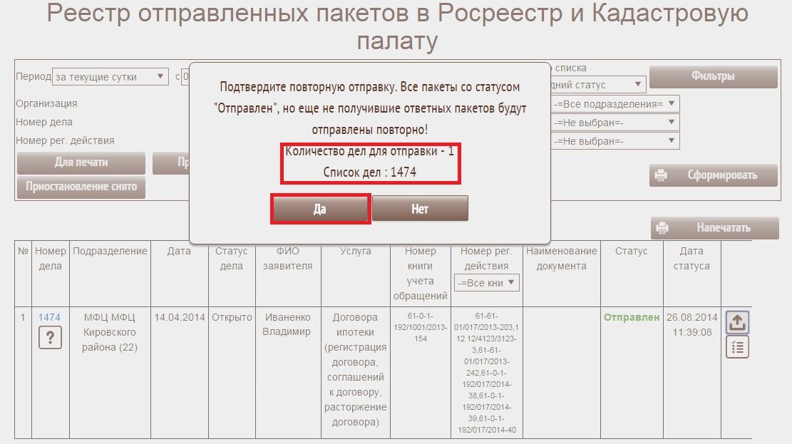 После нажатия на кнопку будет открыто модальное окно. В окне будет видно сколько дел не получили статусные пакеты об успешной загрузке и по каким делам. После проверки правильности выбора списка дел необходимо нажать кнопку "Да".