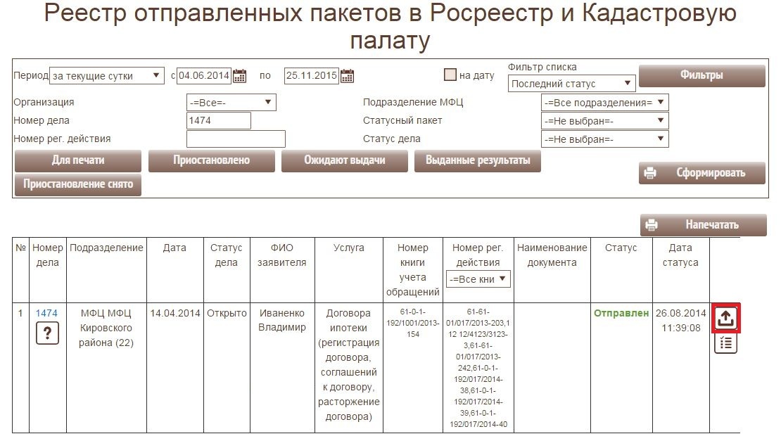 Для этого Вам необходимо открыть форму "Статистика отправленных пакетов". И правильно отфильтровать данные. Нас будут интересовать дела со статусом "Отправлен" и не получившие в ответ статусных пакетов с подтверждением загрузки в систему ведомства.