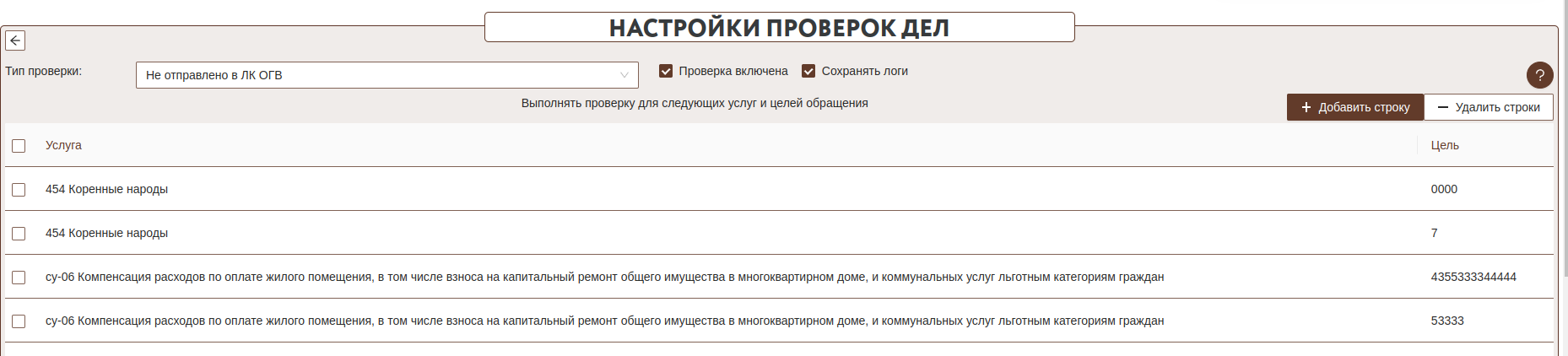 Для некоторых типов проверок необходимо указывать дополнительные параметры. Например для проверки "Не отправлено в ЛК ОГВ" есть возможность указать для каких услуг и целей обращения нужно проверять дела.