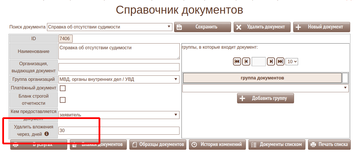 При срабатывании этой задачи будут удалены вложения в документы (сканы и файлы), а также ответы на запросы документов. Документ попадет в список на удаление если у него в справочнике документов заполнен реквизит "Удалить вложения через, дней" и с момента закрытия дела в котором он используется прошло больше указанного количества календарных дней. Удаляемое вложение не должно использоваться в других не закрытых делах, либо закрытых менее указанного количества дней. Очистка происходит с использованием механизма "Очистка сканов документов" в том числе с сохранением логов удалений.