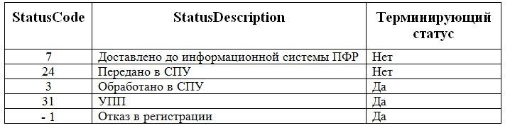 Делаем запрос при помощи адаптера 1096. После того как нам придет ответ о том что заявление получено ПФР, автоматически создается запрос с помощью адаптера 1097 (начинаем опрашивать ПФР по поводу наличия результата). В ответ на запрос отправленный с помощью адаптера 1097 могут приходить следующие статусы: