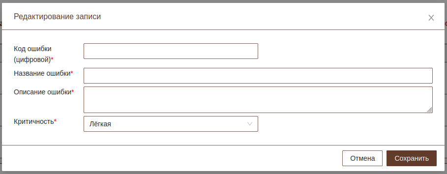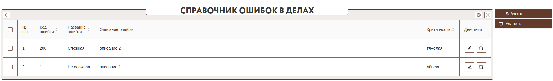 Справочник ошибок в делах позволяет настроить списки ошибок в делах. Добавить в справочник две записи с одинаковыми кодами ошибки нельзя. Поля "Код ошибки", "Название ошибки", "Описание ошибки" и "Критичность" являются обязательными.