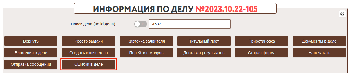 Записанные в справочник ошибки затем можно добавить в дело через информацию по делу (кнопка "Ошибки в деле" доступна пользователям, вошедшим в программу под ролью "Администратор", "Модератор схем услуг", "Менеджер").