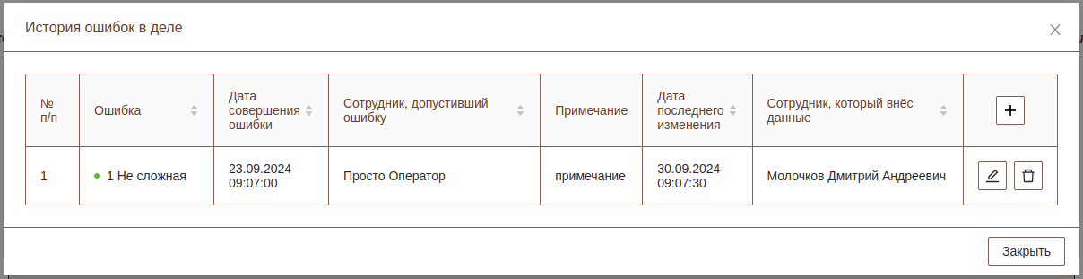При нажатии на кнопку добавления в истории ошибок в делах откроется интерфейс добавления ошибки в дело.