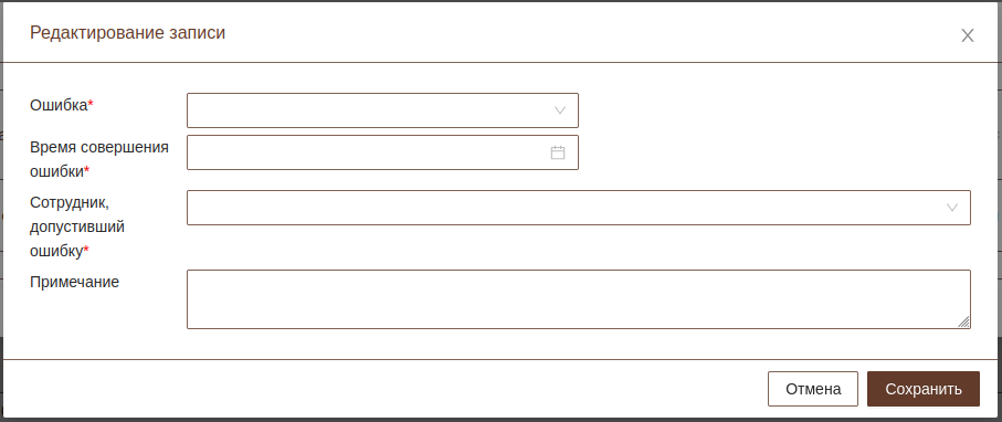 Поля "Ошибка" - выбирается из справочника ошибок, "Время совершения ошибки" и "Сотрудник, допустивший ошибку" являются обязательными.