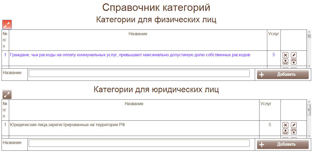 Справочник категорий позволяет настроить списки категорий для услуг. При удалении категории проверяется связь с услугами, если хотя бы одна услуга использует данную категорию - удаление запрещено. При добавление проверяется уникальность имени, что бы избежать дублей.