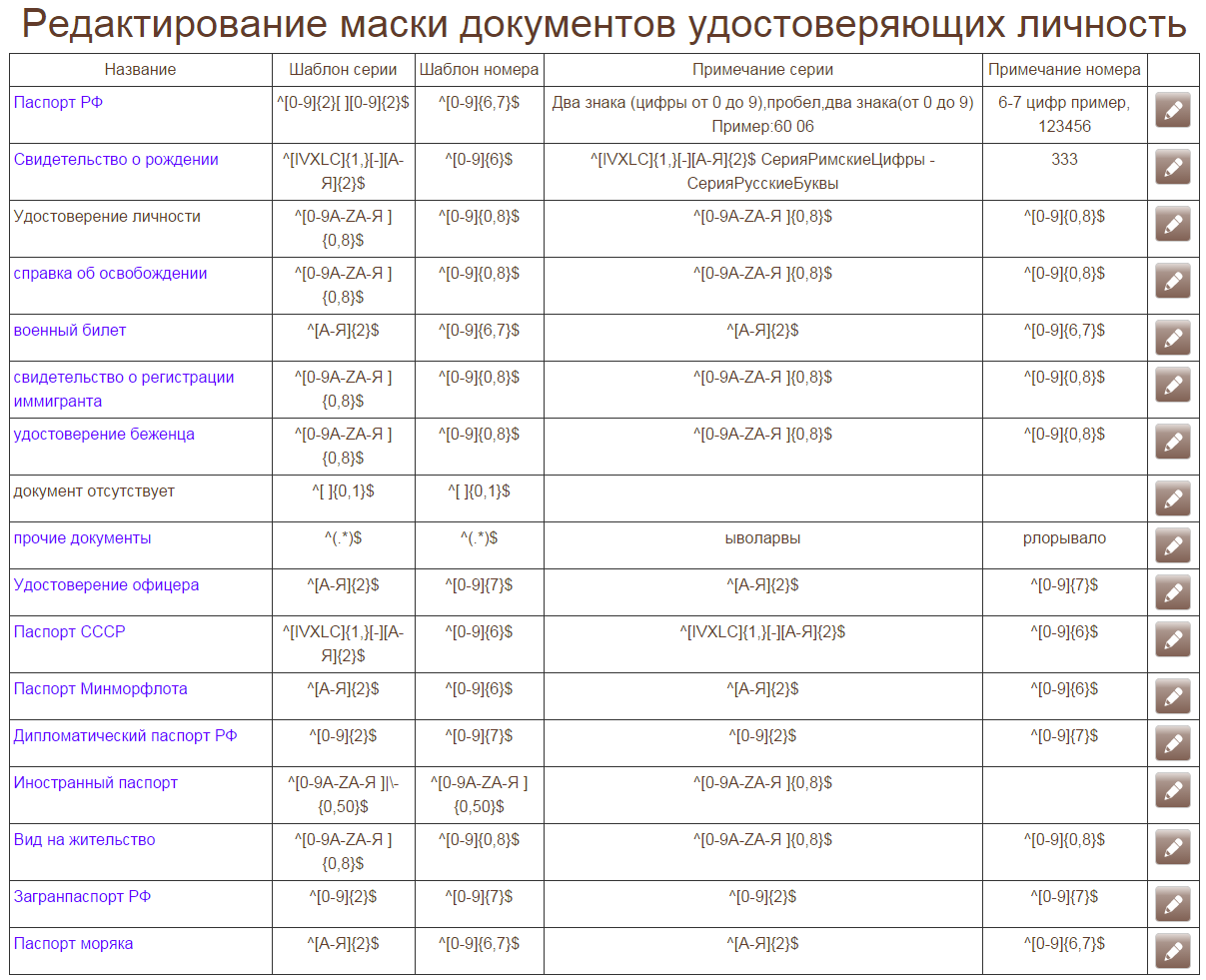 В этой форме можно редактировать примечания для документов удостоверяющих личность. Для информации показаны маски документов, которые в данный момент используются.