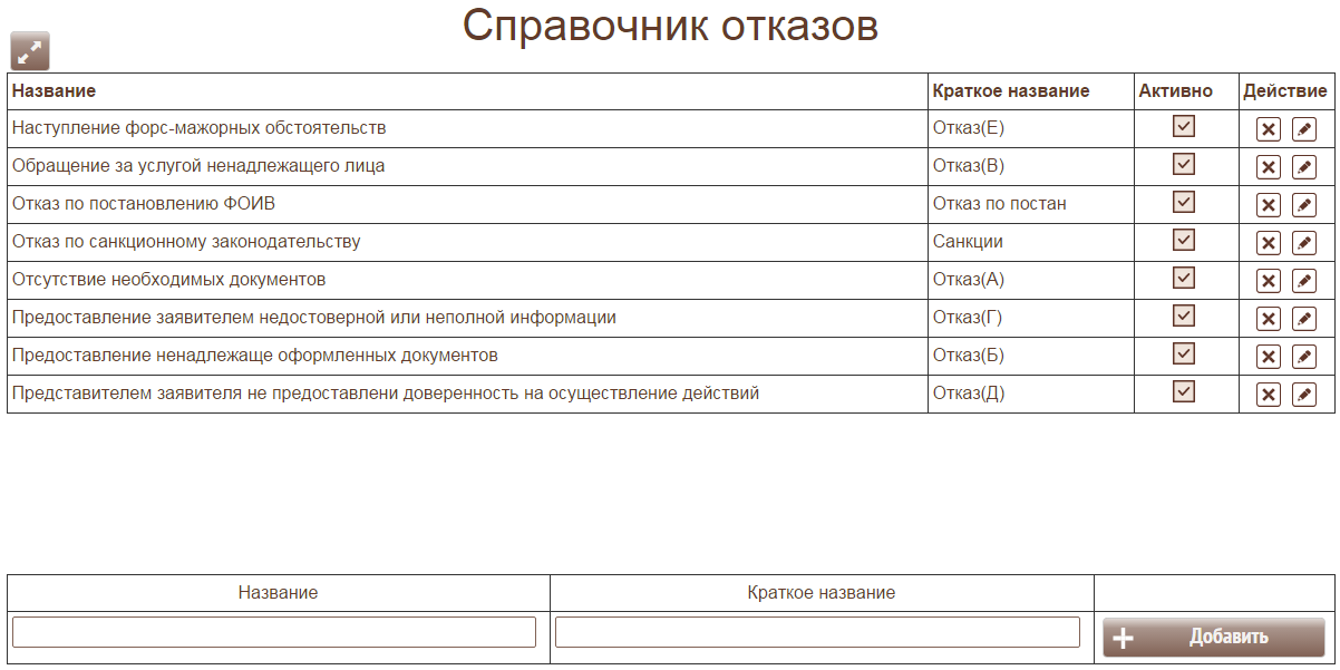 Справочник отказов позволяет настроить списки отказов для услуг. При удалении проверяется связь с делами, если хотя бы одно дело использует данный отказ - удаление запрещено. При добавление проверяется уникальность имени, что бы избежать дублей.