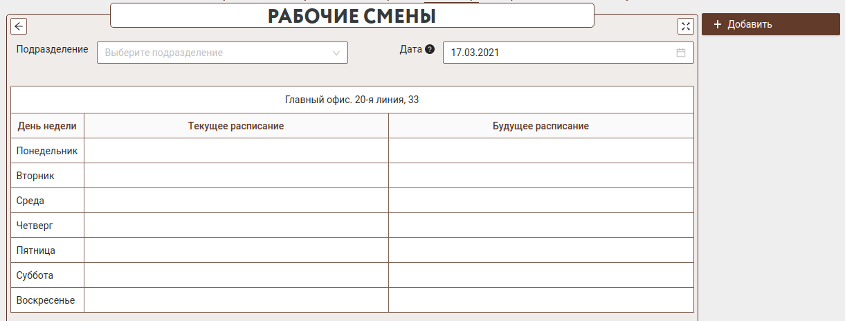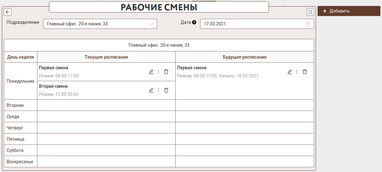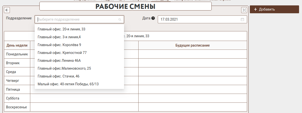 Рабочие смены могут быть указаны для любого дня недели у каждого офиса. Фильтр по подразделениям поможет оставить только один офис для просмотра рабочих смен и предзаполнит поле "подразделение" при добавлении новых смен.