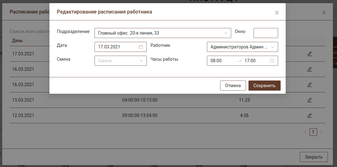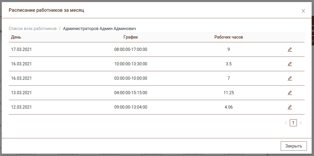 По каждому работнику можно просмотреть список дней работы с графиком смены и при необходимости внести корректировки.
