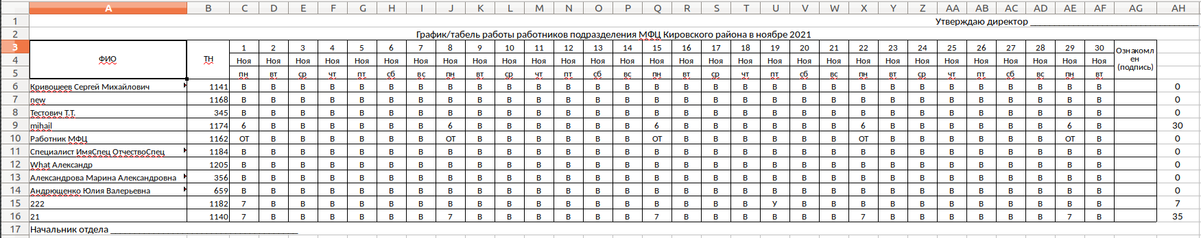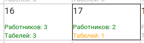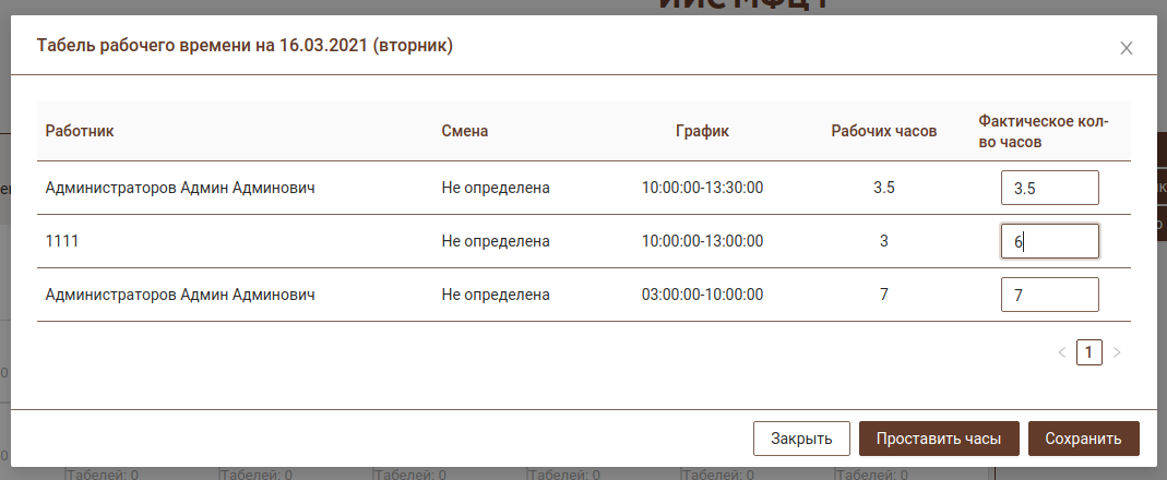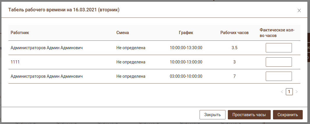 По каждому дню можно указать табель рабочего времени. В этой форме будет отображаться список всех сотрудников, работающих в этот день с возможностью указать количество фактических часов работы.