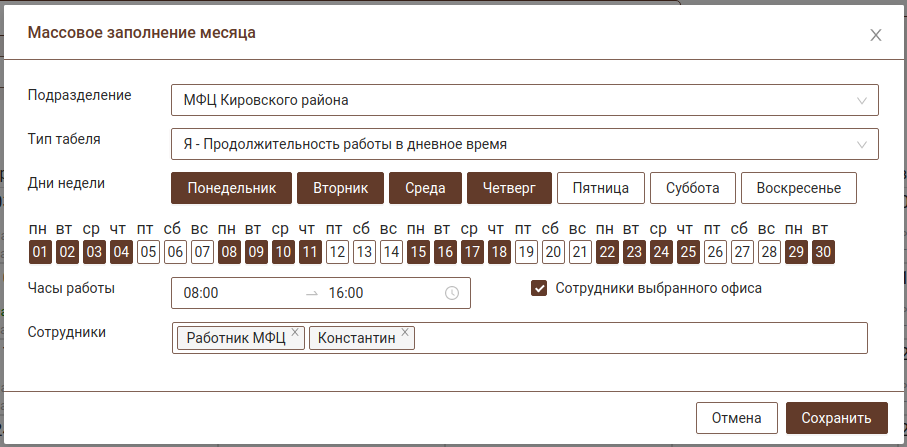 Возможно массово заполнить месяц в одной форме. Для этого необходимо выбрать дни недели, которые будут выделены в календаре. При необходимости можно отдельно выделить/отменить выделение нужного числа в календаре. По умолчанию будет производиться фильтрация списка сотрудников по подразделению, при необходимости фильтрацию по подразделению можно отключить.