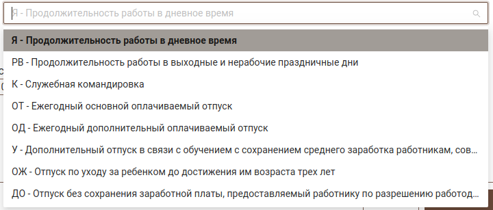 Типы табеля позволяют выбрать из справочника необходимое значение.