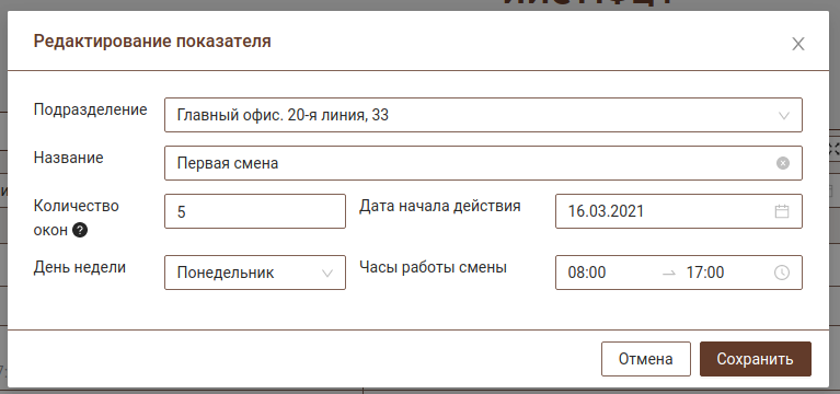 При добавлении или редактировании смены необходимо будет указать ряд реквизитов. Количество окон является не обязательным для заполнения.