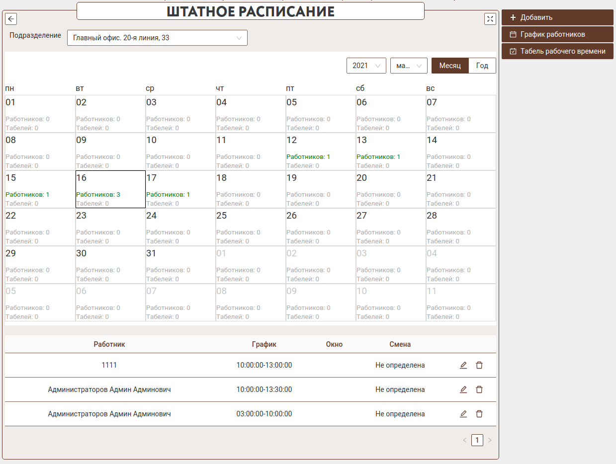 После выбора подразделения будет показан календарь для текущего месяца. На каждый день можно добавить список сотрудников работающих в этот день.