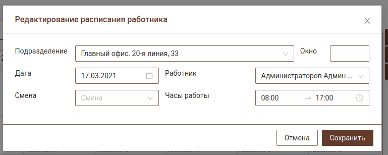 Для добавления или редактирования сотрудников необходимо укаазать подразделение, работника и часы работы. Если заполнены смены на этот день, то часы работы будут автоматически проставлены в соответствии с выбранной сменой.