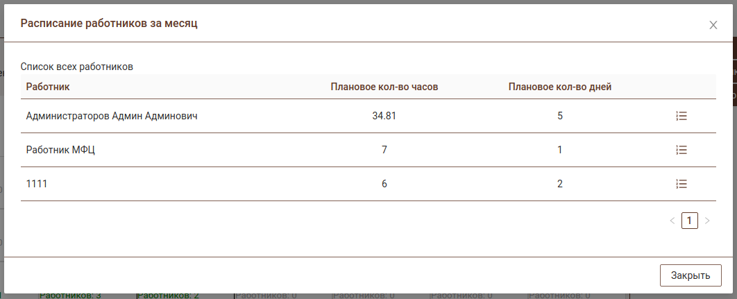 При выборе дня под календарем будет отображаться таблица с сотрудниками, которые по плану должны работать в этот день.