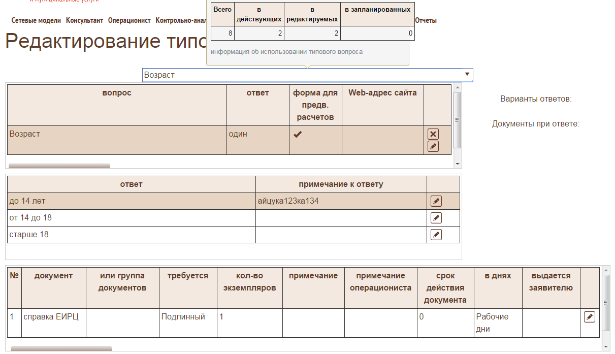 Для уменьшения времени обслуживания заявителей введено понятие типового вопроса. В схемах порядков оказания услуги существуют часто повторяющиеся вопросы (например гражданство РФ, доходы и т.п.). В случае, если заявитель получает несколько услуг, то ему задаются одни и те же вопросы несколько раз, при том, что АИС МФЦ уже хранит ответы на них. Теперь можно определить такие вопросы и указать их в порядке оказания консультаций, что позволит в дальнейшем при опросе заявителя операционистом автоматически устанавливать ответы и предоставленные документы в соответствии с ответами, данными ранее.