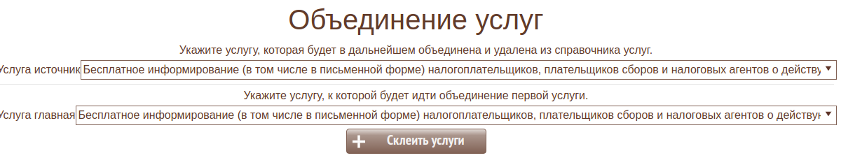 Существует возможность объединенения услуг путем склеивания их в один экземпляр. При этом происходит перенос всех дел, версий услуг, консультаций и статистики приема удаляемой услуги на основную. Настройки исходной услуги (бланки документов, доверенности и т.д.) удаляются. Могут быть объединены две собственные услуги МФЦ, две репозиторные услуги и собственная на репозиторную (с удалением собственной). Объединение репозиторной на собственную (с удалением репозиторной) запрещено. Эта возможность позволяет навести порядок среди услуг, убрав их дубликаты и устаревшие услуги.
