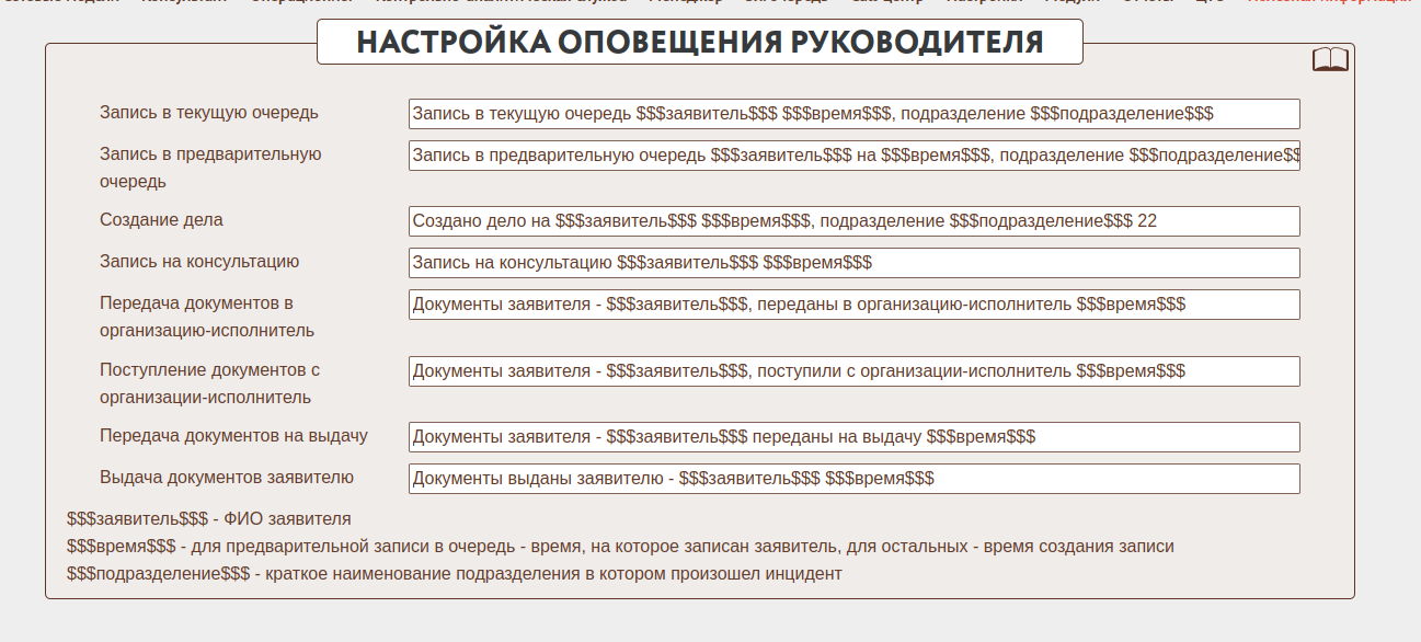 - Настроить текстов сообщений (Настройки->Настройки->Оповещение руководителя)