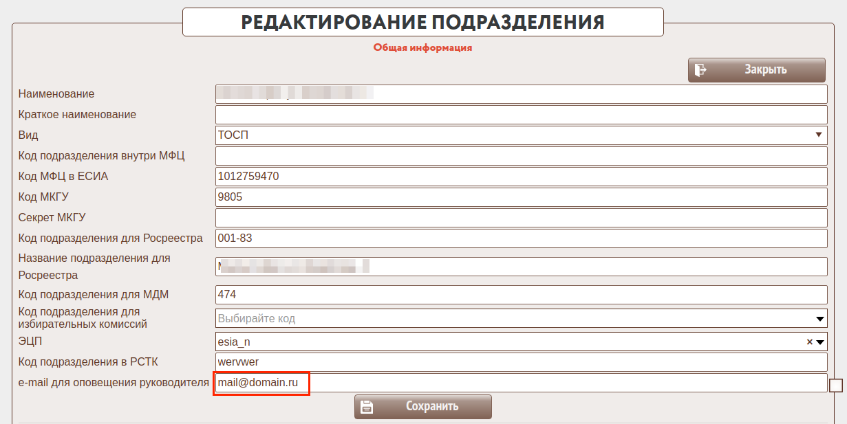 - Настроить в структуре МФЦ "e-mail для оповещения руководителя" с адресом электронной почты ответственного лица в каждом подразделении;