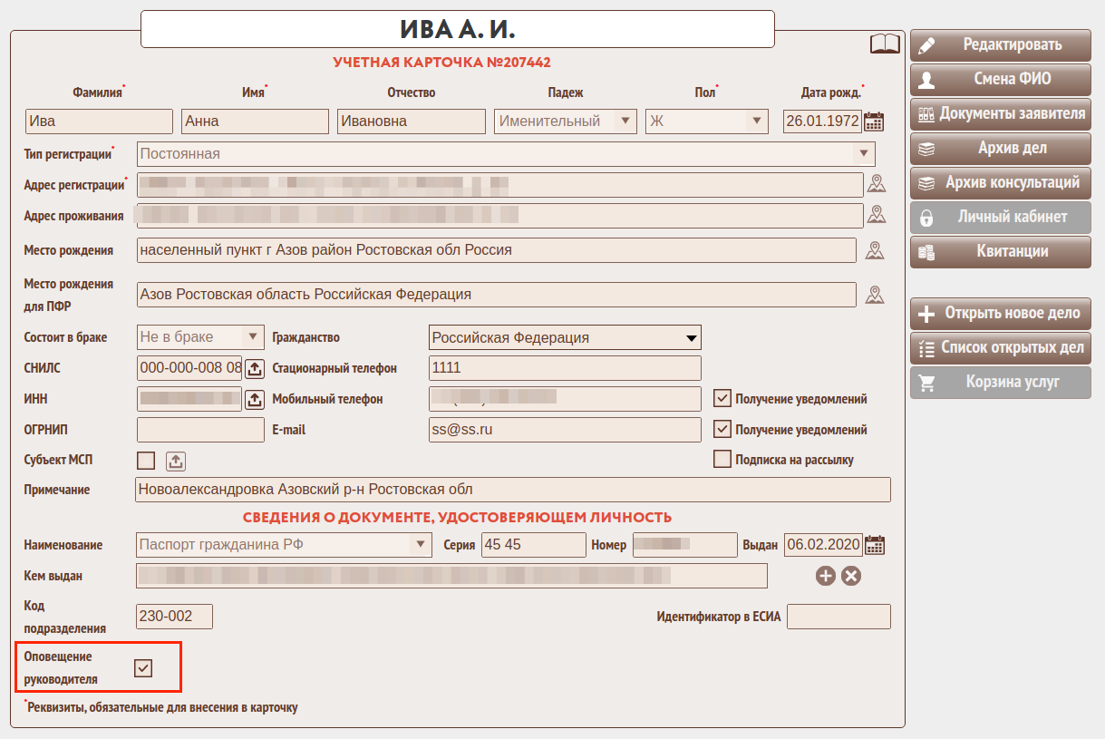 - Настроить в карточке нужных заявителей опцию "Оповещение руководителя". Настройка доступна только Администратору.